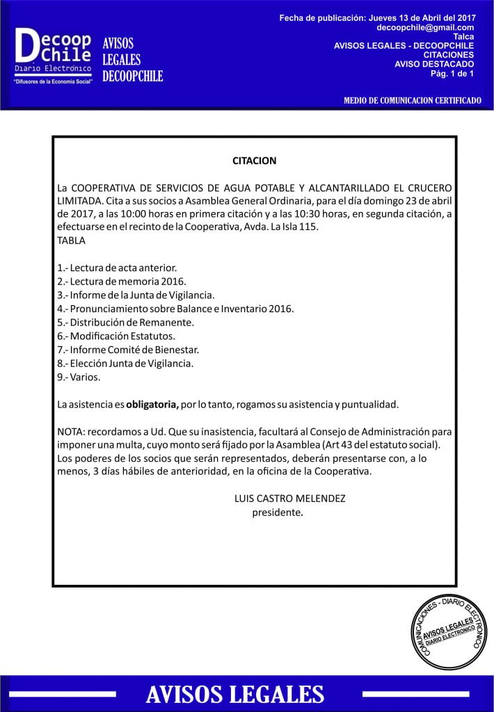 Se cita a Junta general a los socios de la Cooperativa de APR El Crucero a la celebración de la Asamblea General Ordinaria de Socios, que se llevará a cabo el próximo 23 de abril.