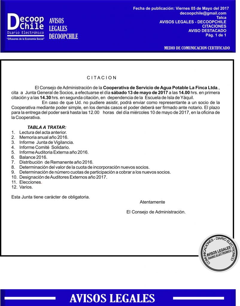Se cita a Junta general a los socios de la Cooperativa de APR LA FINCA Ltda., que se llevará a cabo el próximo 13 de mayo.