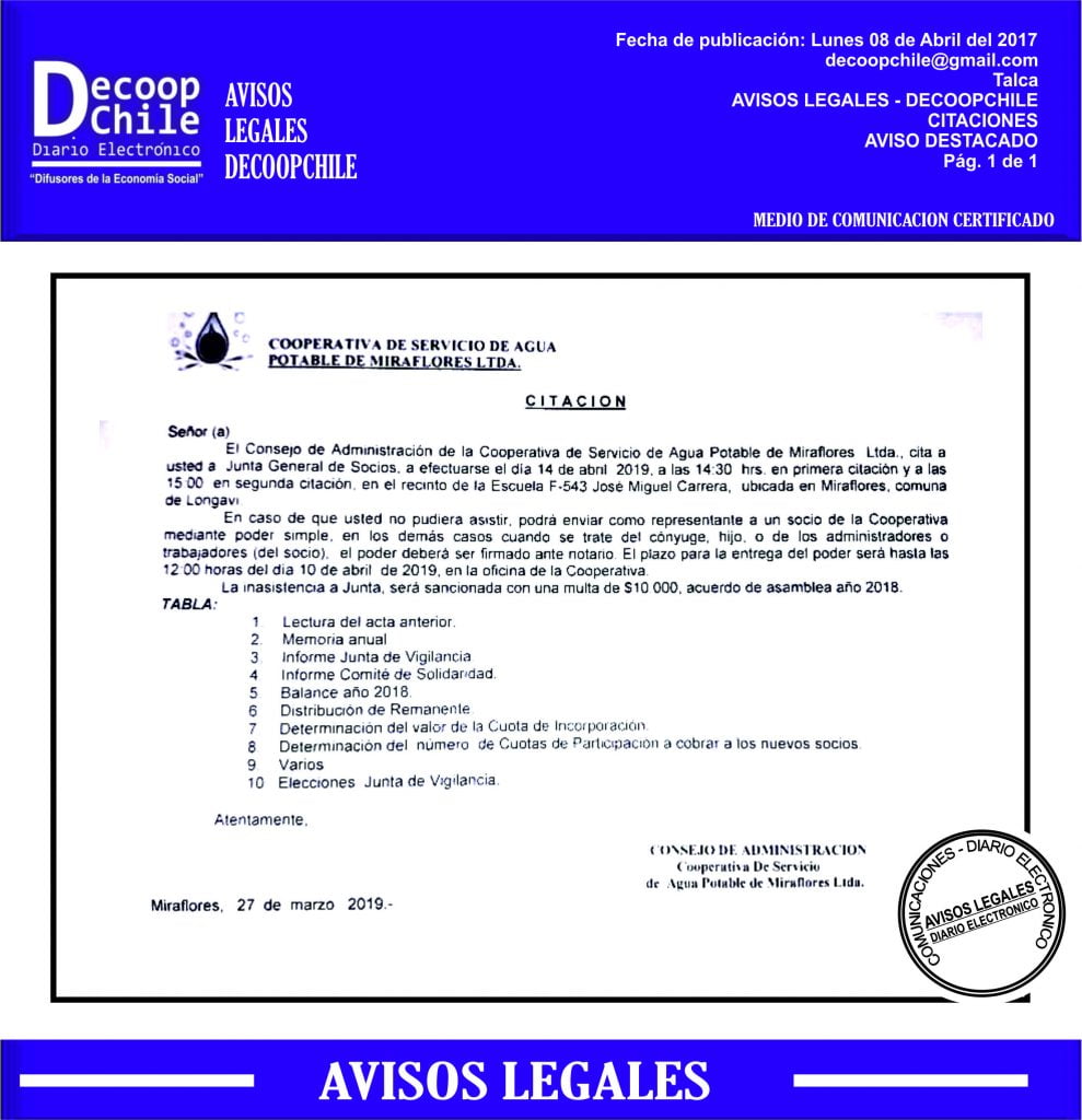 Se cita a  Junta de Socios  de la Cooperativa de APR Miraflores, que se llevará a cabo el próximo 14 de Abril.