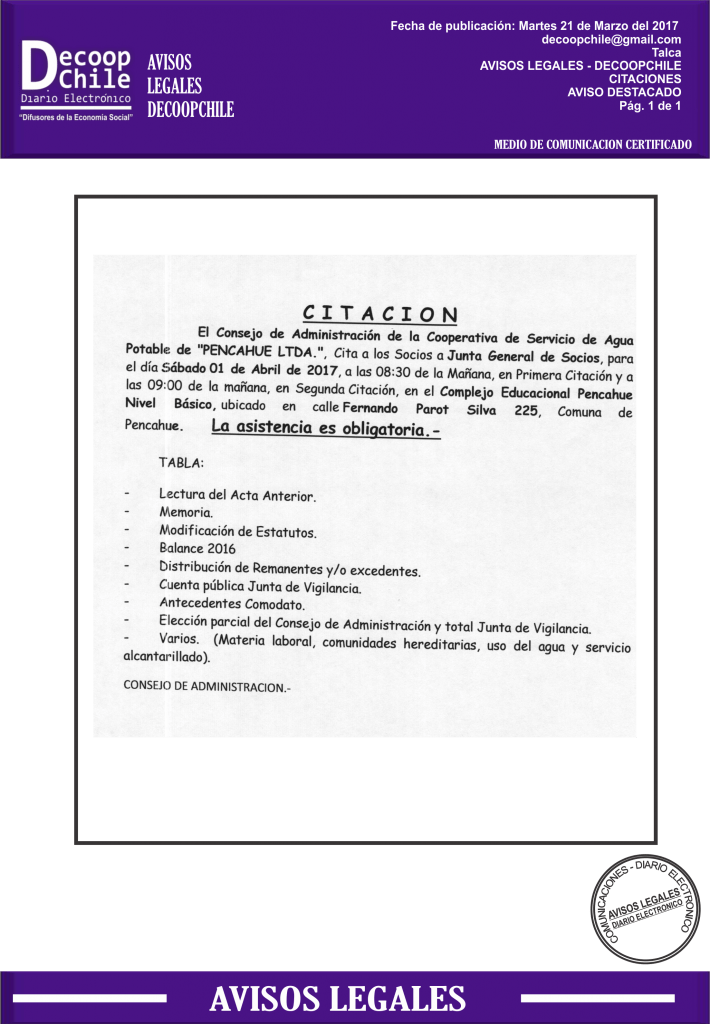 Se cita a Junta general a los socios de la Cooperativa APR Pencahue este Sabado 01 de Abril de 2017