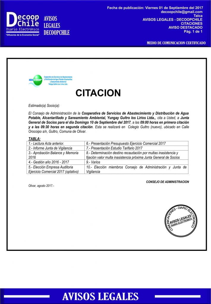 Se cita a Junta general a los socios de la Cooperativa de APR YUNGAY GULTRO LOS LIRIOS LTDA., que se llevará a cabo el próximo 10 de Septiembre.