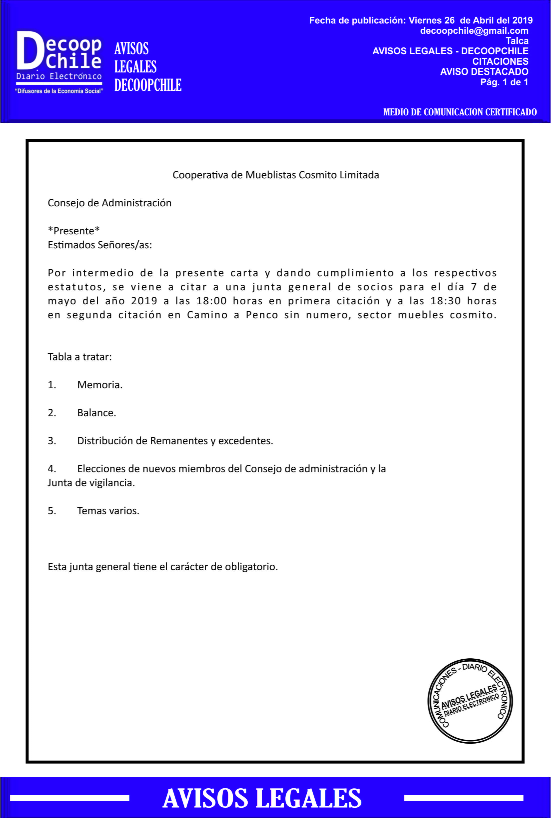 Se cita a Junta de Socios de la Cooperativa de Mueblistas Cosmito Ltda., que se llevará a cabo el próximo 07 de Mayo.