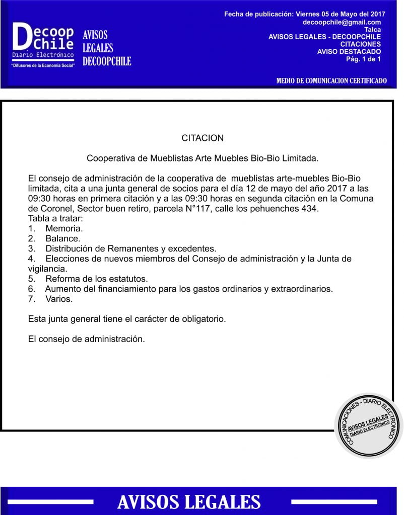 Se cita a Junta general a los socios de la Cooperativa de Mueblistas Arte Bio-Bio Ltda, que se llevará a cabo el próximo 12 de mayo