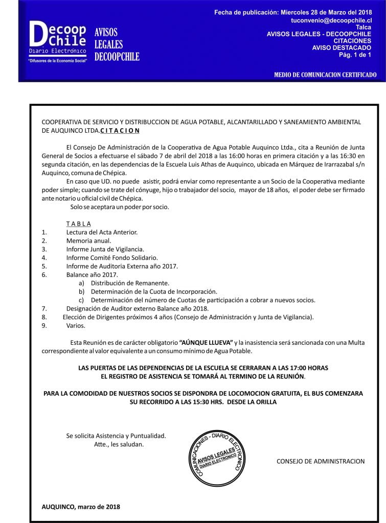 La Cooperativa de Servicio y Distribución de Agua Potable Auquinco Ltda. . cita a una junta general de socios para el día 07 de Abril de 2018.