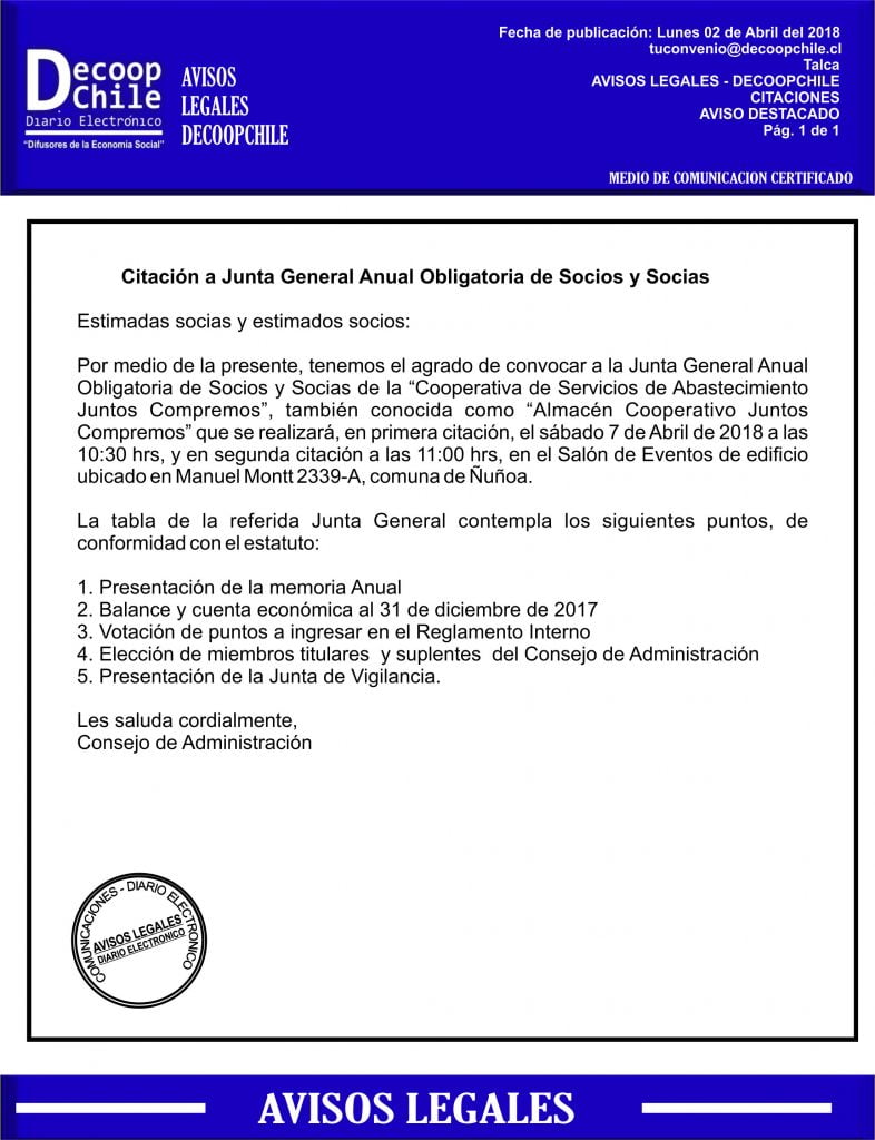 La ”Cooperativa de Servicios de Abastecimiento Juntos Compremos” cita a una junta general de socios para el día 07 de Abril de 2018.