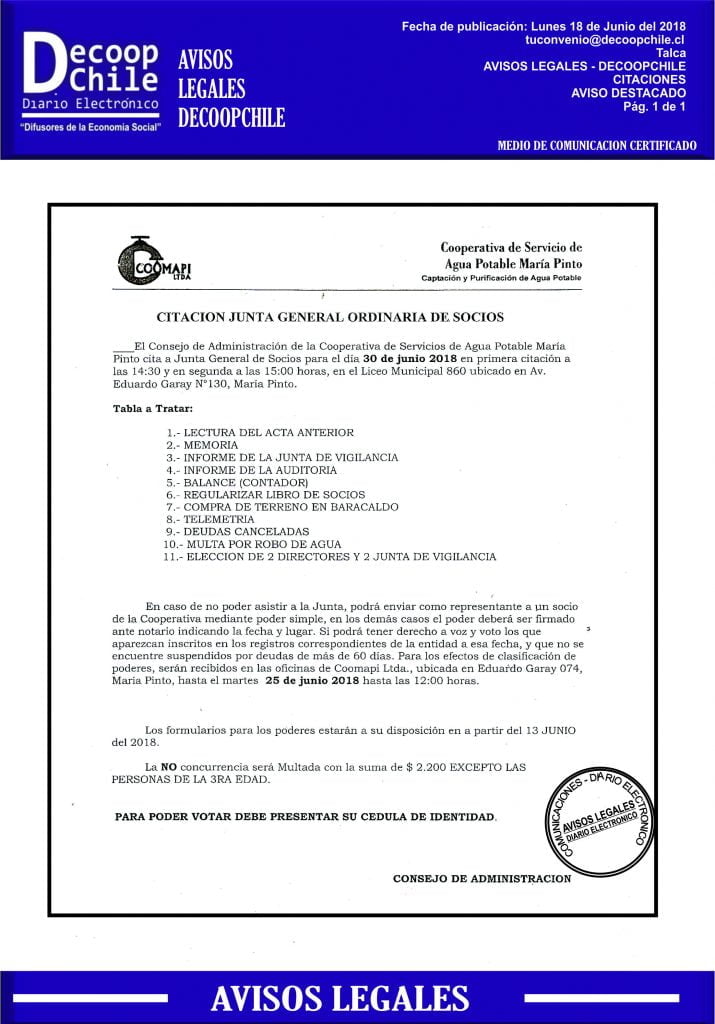 Se cita a Junta general a los socios de la Cooperativa de Servicios de Agua Potable Maria Pinto que se llevará a cabo el próximo 30 de Junio.