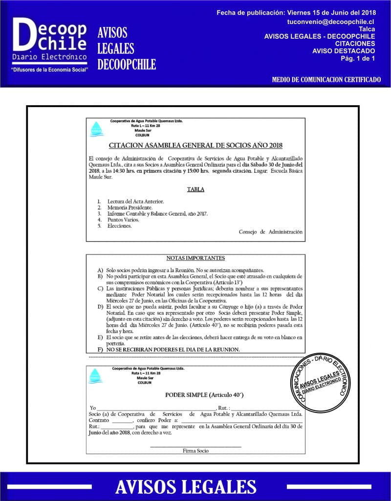 Se cita a Junta general a los socios de la Cooperativa de Servicios de Agua Potable y Alcantarillado Quemaus Ltda.. que se llevará a cabo el próximo 30 de Junio.