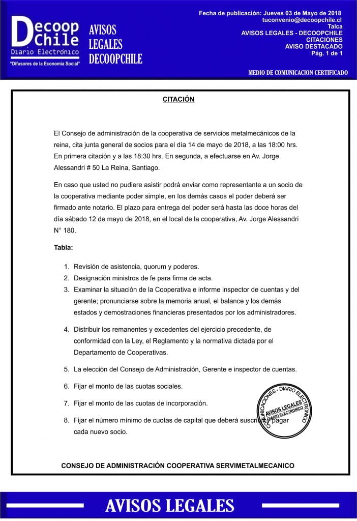 Se cita a Junta general a los socios de las Cooperativa de Servicios Metalmecanicos de La Reina que se llevará a cabo el próximo 14 de Mayo.