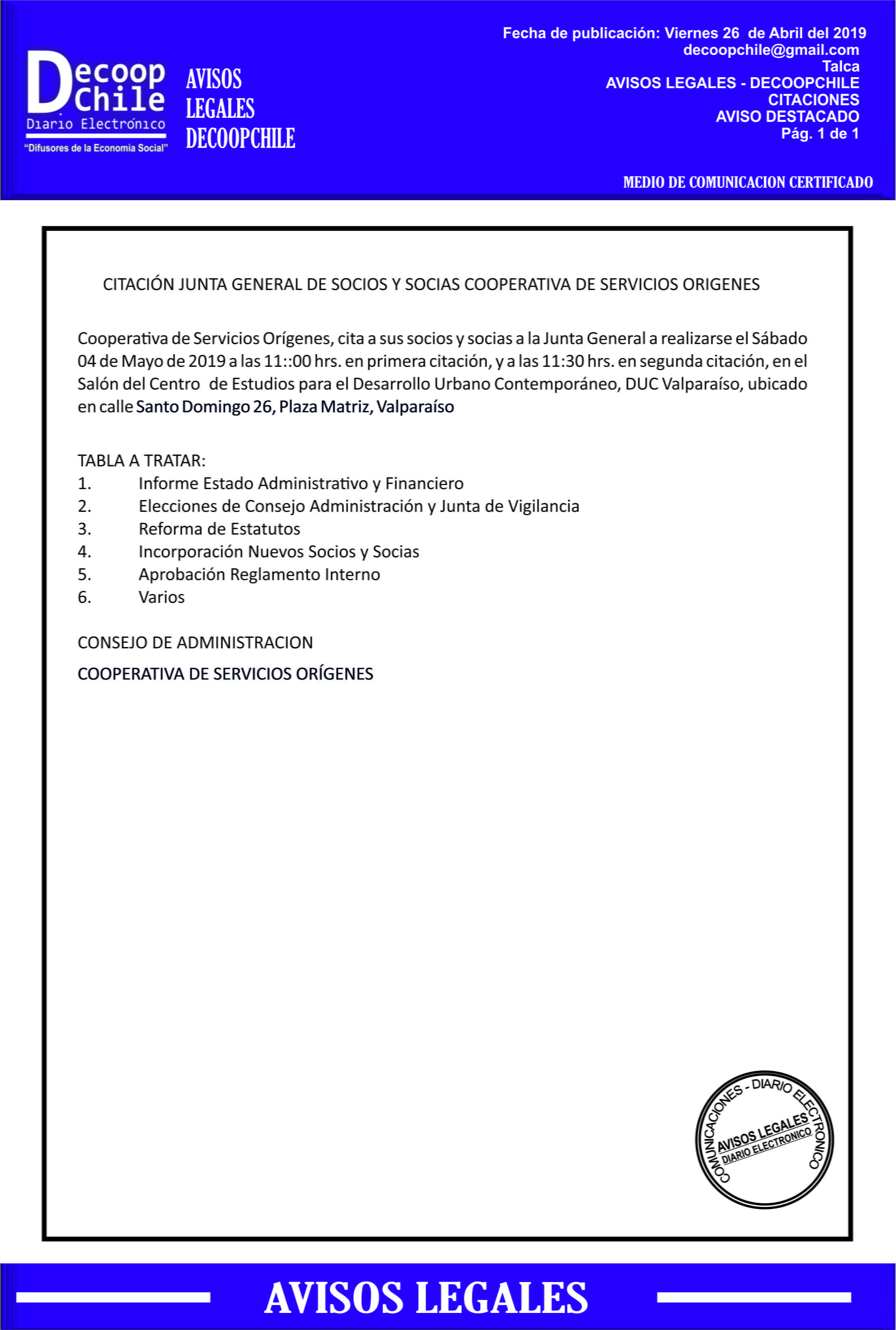 Se cita a Junta de Socios de la Cooperativa de Servicios Origenes, que se llevará a cabo el próximo 04 de Mayo de 2019.