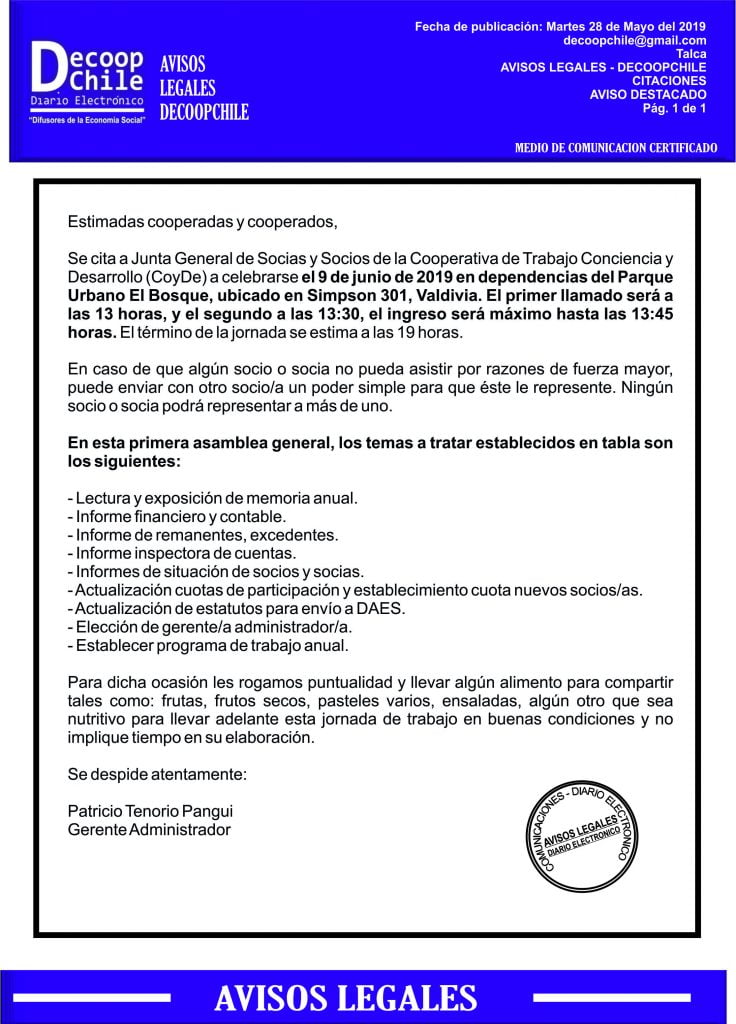 Se cita a Junta de Socios de la Cooperativa de Trabajo Conciencia y Desarrollo (CoyDe) que se llevará a cabo el próximo 09 de Junio