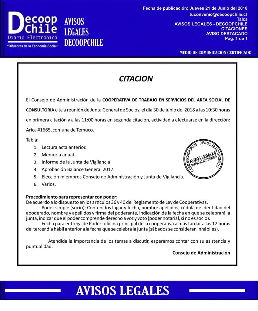 Se cita a Junta general a los socios de la Cooperativa de Trabajo en Servicios del Área Social de Consultoria, que se llevará a cabo el próximo 30 de Junio.