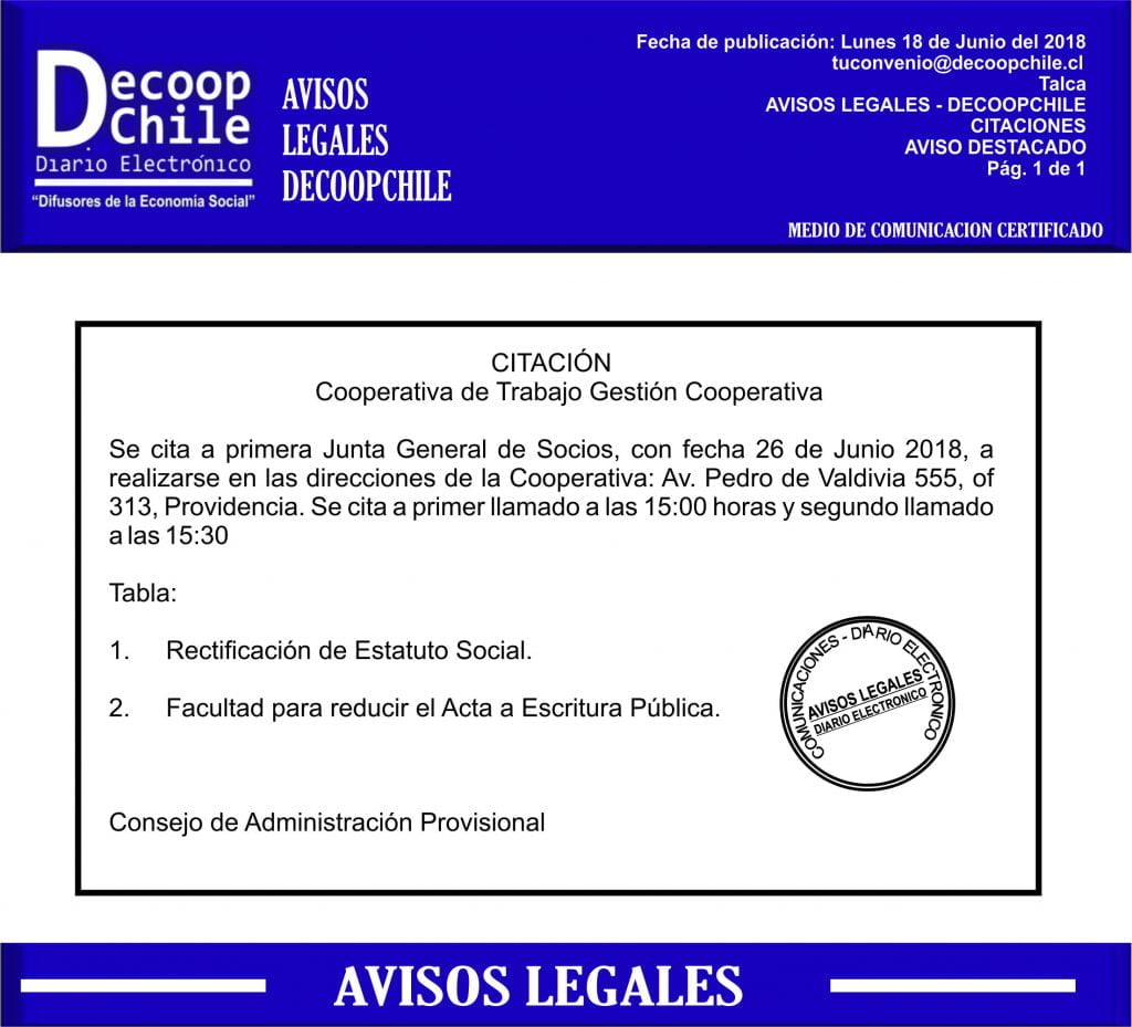 Se cita a Junta general a los socios de la Cooperativa de Trabajo Gestión Cooperativa que se llevará a cabo el próximo 26 de Junio.