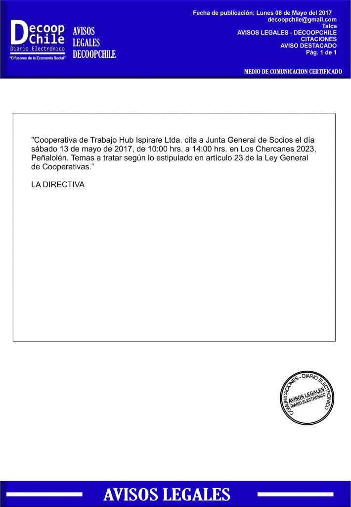 Se cita a Junta general a los socios de la Cooperativa de Trabajo Hub Inspirare Ltda., que se llevará a cabo el próximo 13 de mayo.