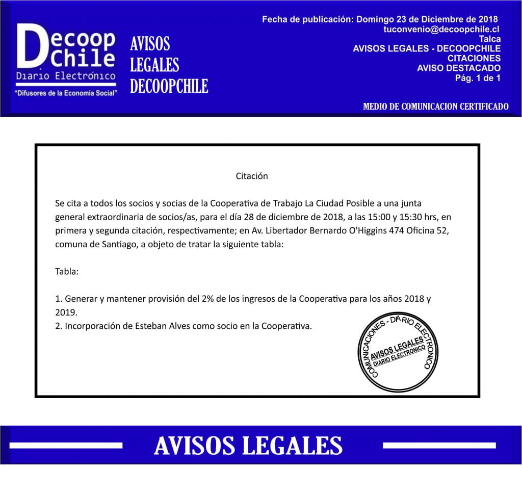 Se cita a Junta de Socios de la Cooperativa de Trabajo La Ciudad Posible, que se llevará a cabo el próximo 28 de Diciembre
