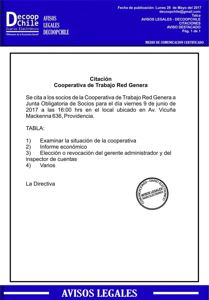 Se cita a Junta general a los socios de “Cooperativa de Trabajo Red Genera” , que se llevará a cabo el próximo 09 de Junio.