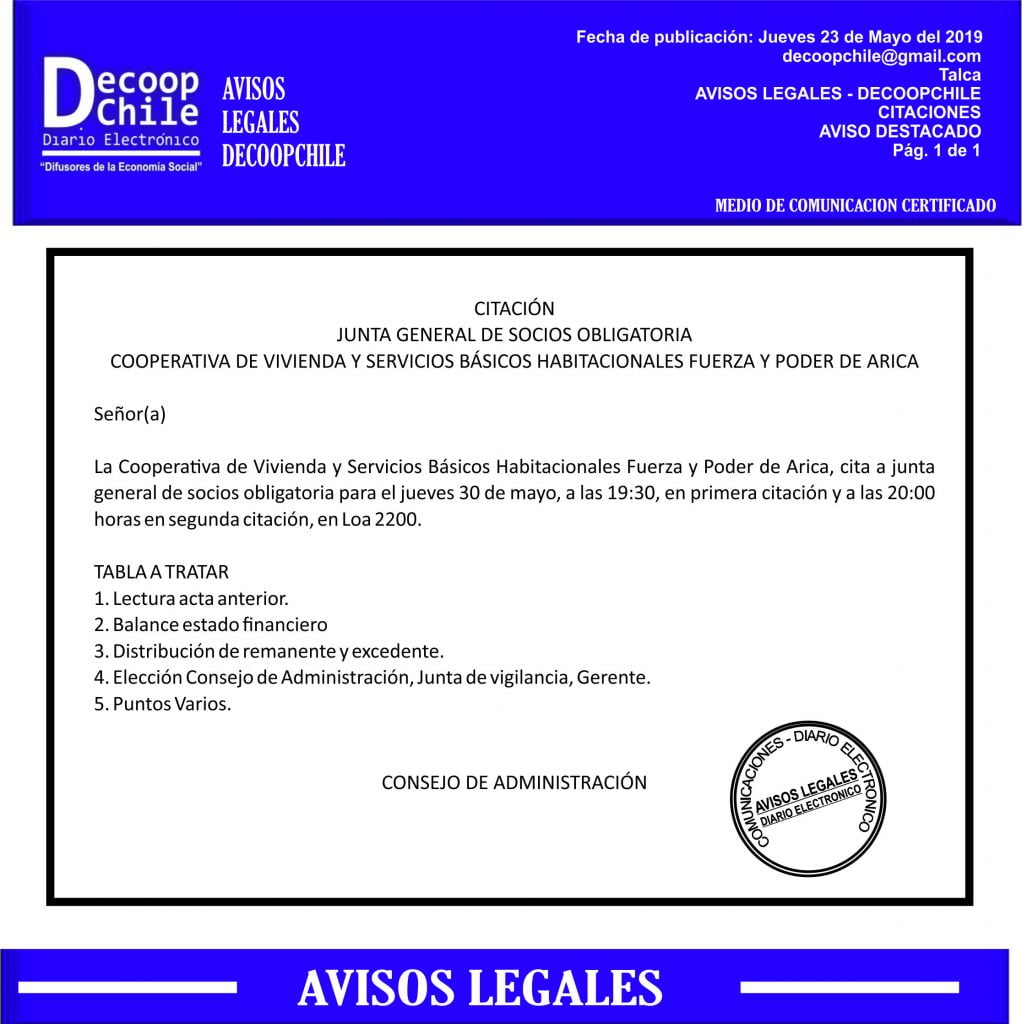 Se cita a Junta de Socios de la Cooperativa de Vivienda y Servicios Básicos Habitacionales Fuerza y Poder de Arica que se llevará a cabo el próximo 30 de Mayo.
