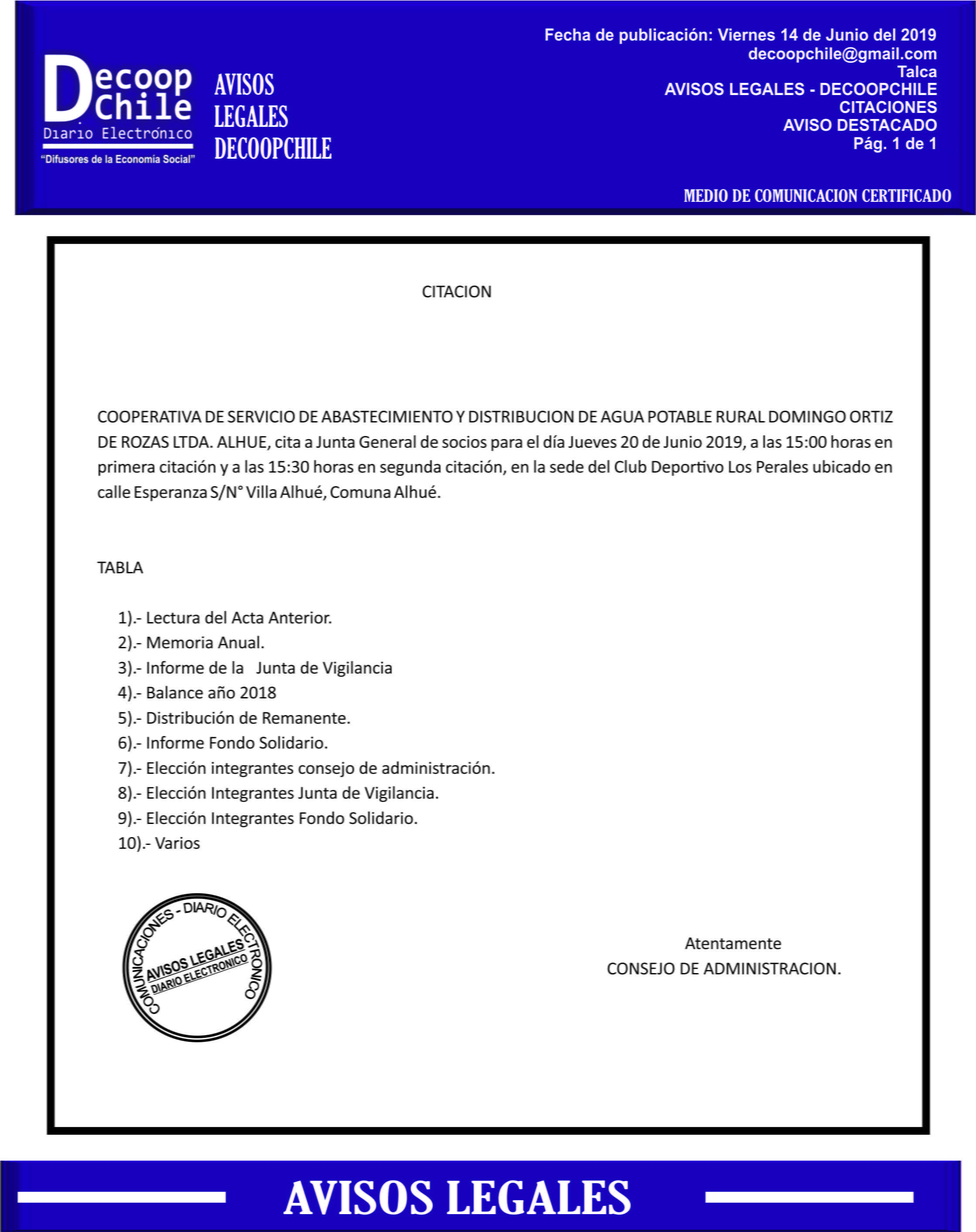 Se cita a Junta de Socios de la Cooperativa Domingo Ortiz de Rosas Ltda. que se llevará a cabo el próximo 20 de Junio