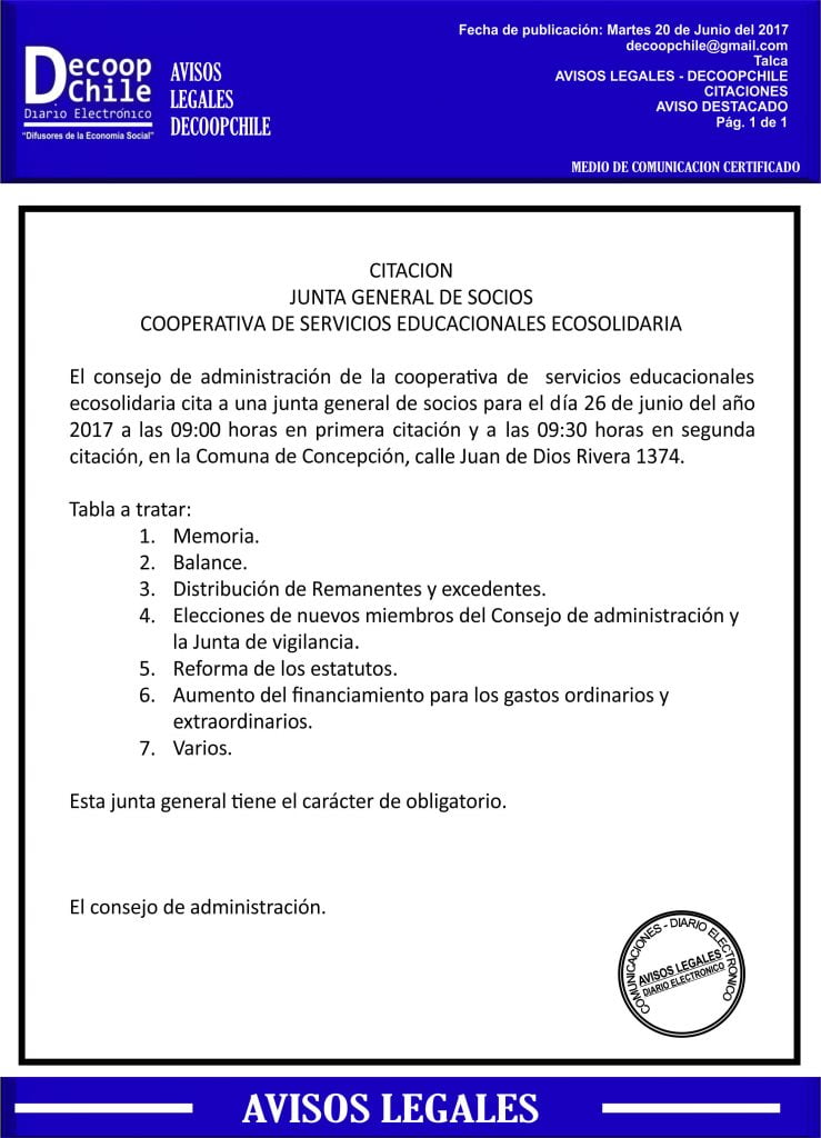 Se cita a Junta general a los socios de la Cooperativa de Servicios Educacionales ECOSOLIDARIA, que se llevará a cabo el próximo 26 de Junio.