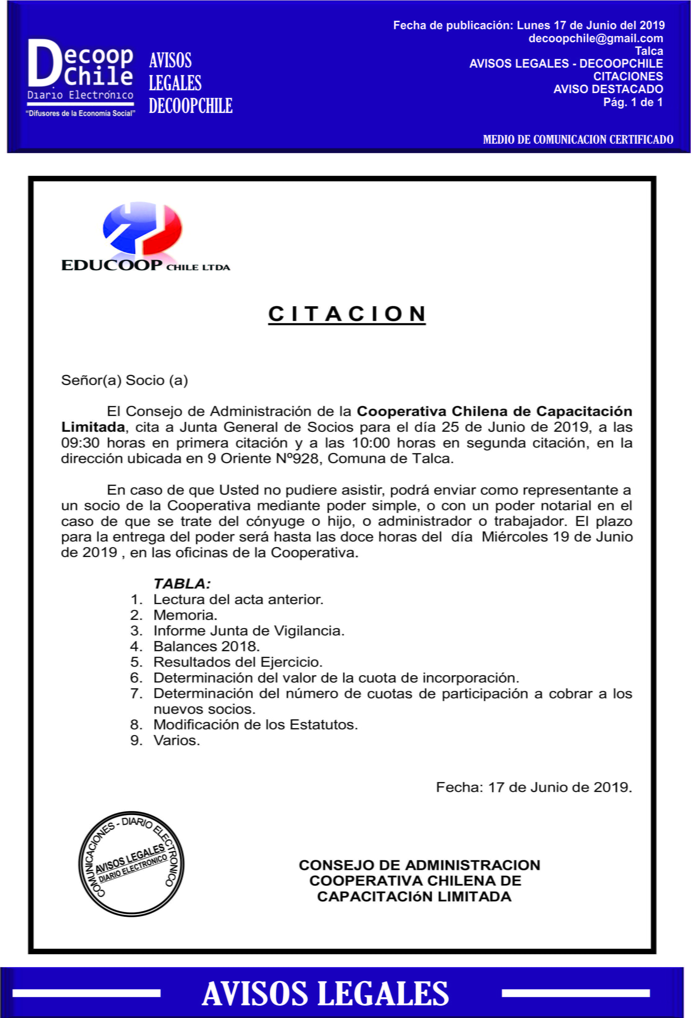 Se cita a Junta de Socios de la Cooperativa Chilena de Capacitación Educoop, que se llevará a cabo el próximo 25 de Junio