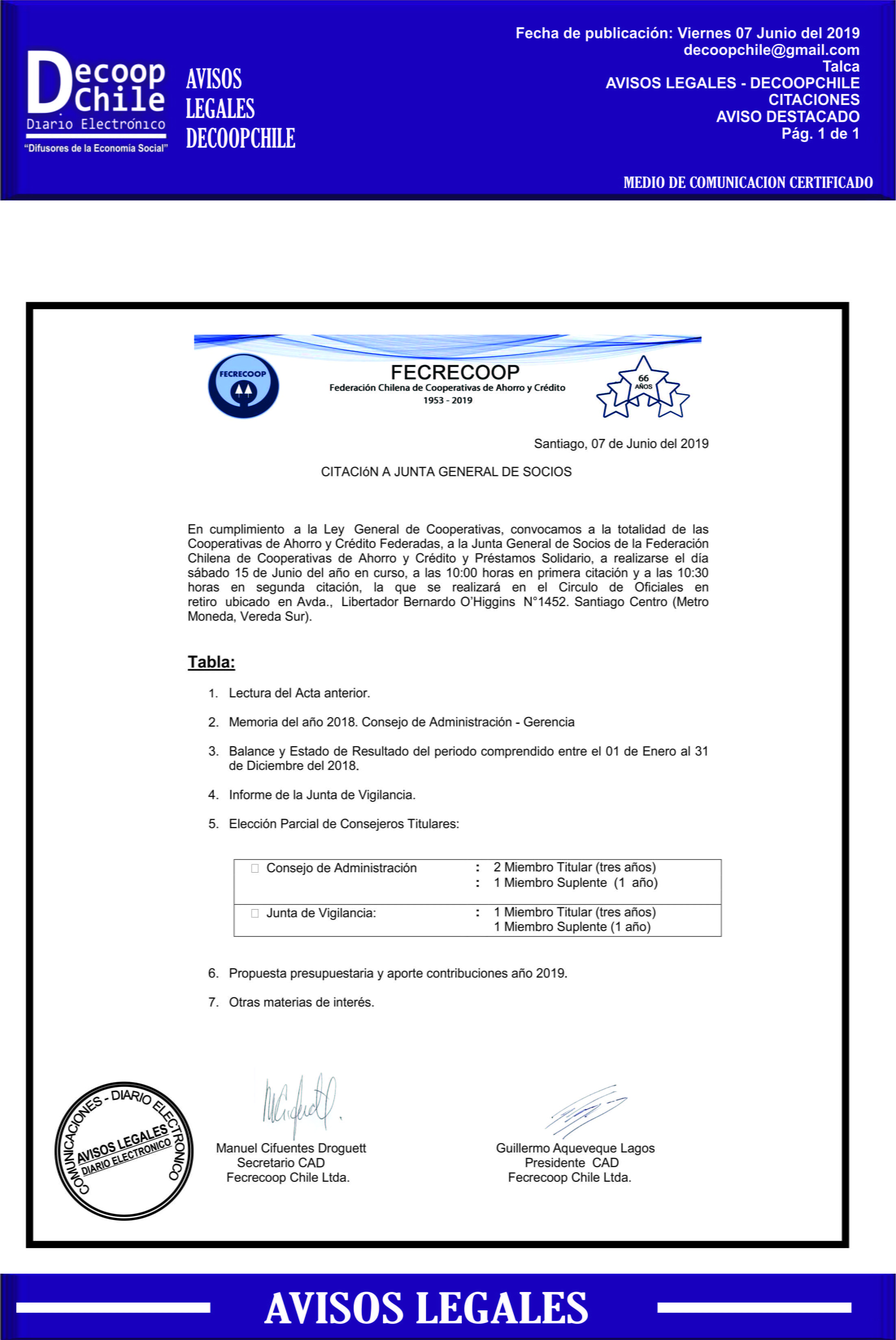 Se cita a Junta de Socios de la Cooperativa Fecrecoop que se llevará a cabo el próximo 15 de Junio
