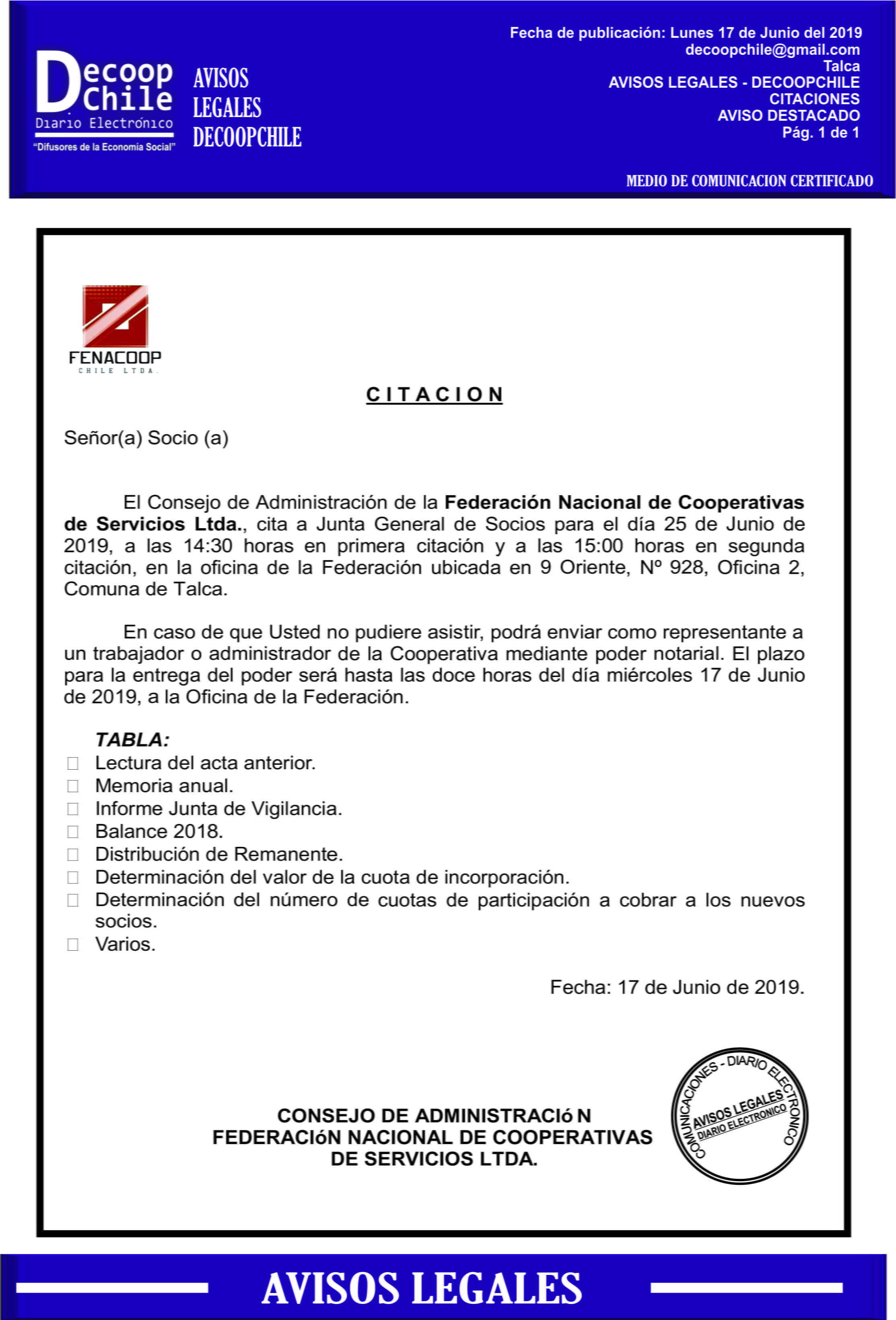 Se cita a Junta de Socios de la Cooperativa FENACOOP que se llevará a cabo el próximo 25 de Junio