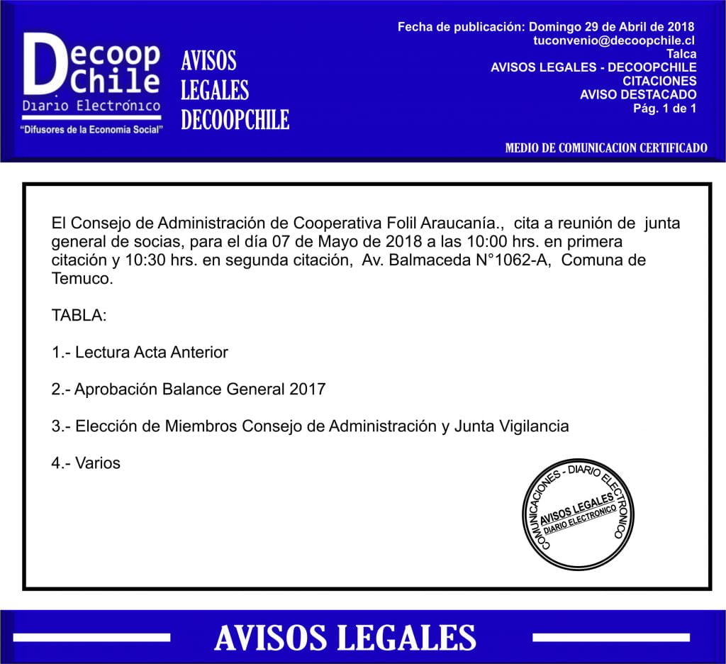Se cita a Junta general a los socios de las Cooperativa Folil Araucania que se llevará a cabo el próximo 07 de Mayo.