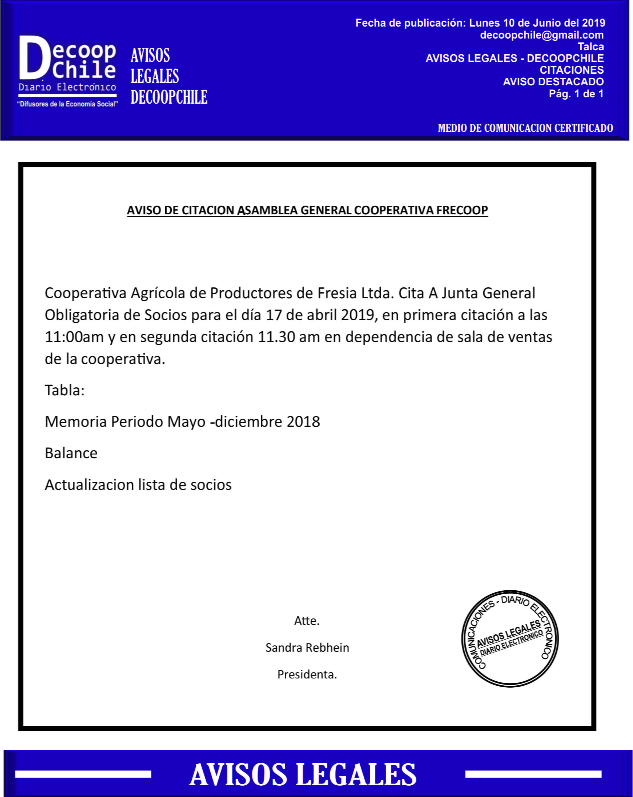 Se cita a  Junta de Socios  de la Cooperativa Frecoop que se llevará a cabo el próximo 17 de Junio