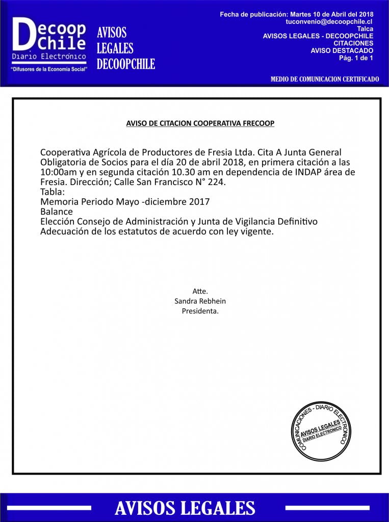 La ”Cooperativa Frecoop” cita a una junta general de socios para el día 20 de Abril de 2018.