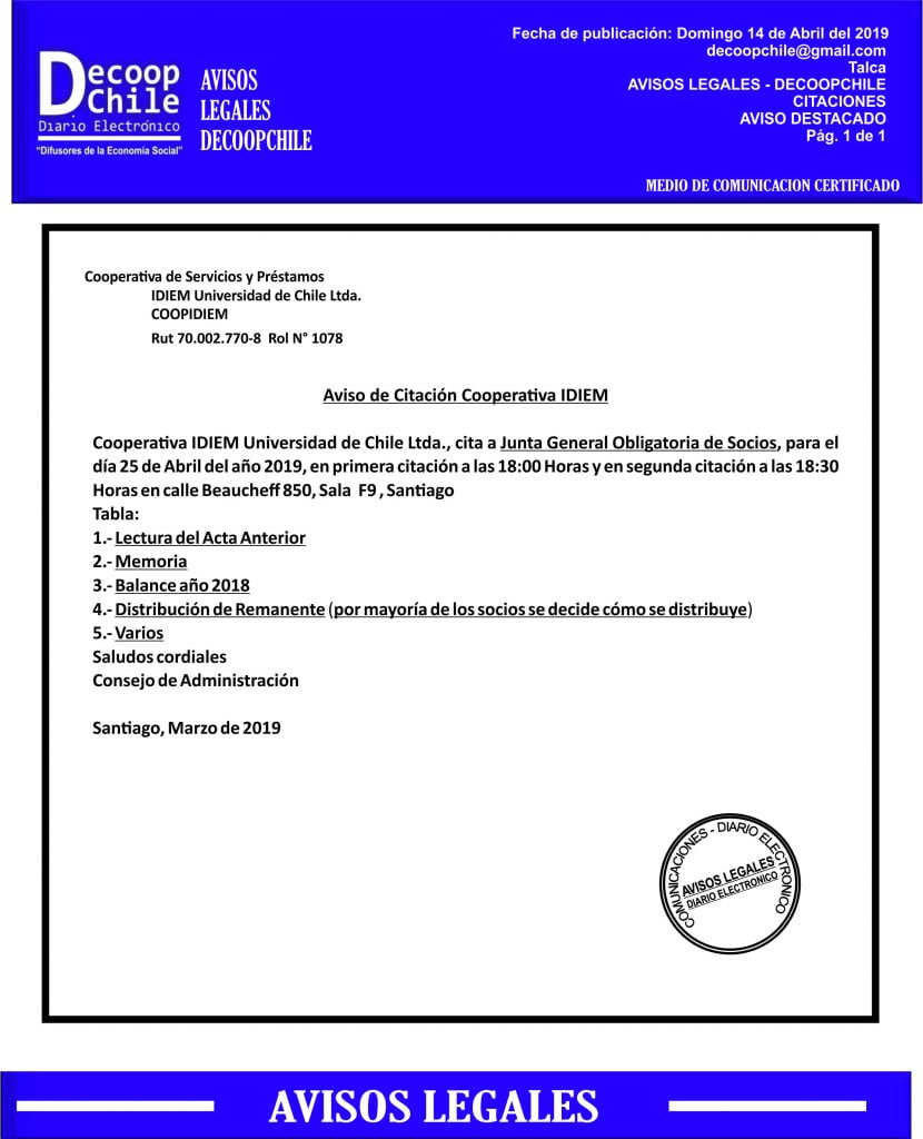 Se cita a Junta de Socios de la Cooperativa IDIEM Universidad de Chile Ltda que se llevará a cabo el próximo 25 de Abril.