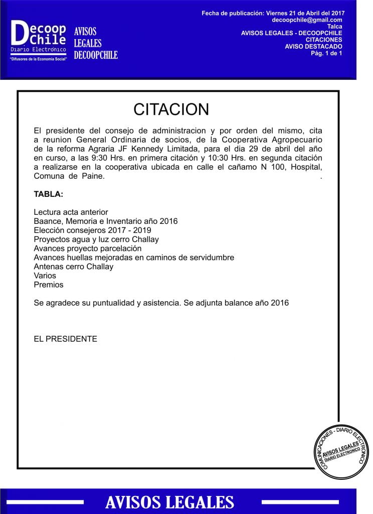 Junta General de Socios: “Cooperativa JF KENNEDY Ltda.”