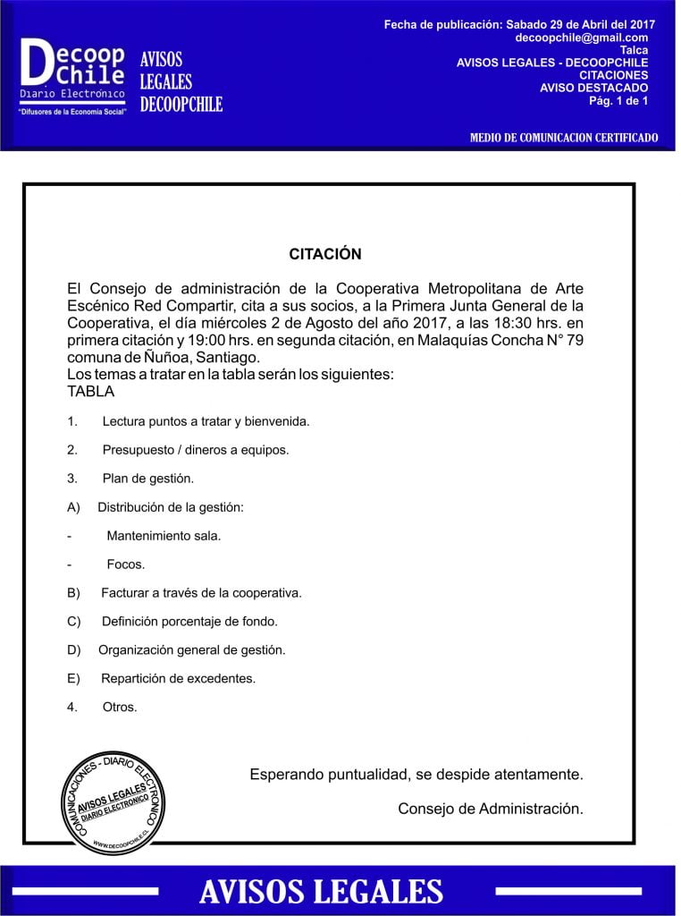 item-thumbnailSe cita a Junta general a los socios de la Cooperativa Metropolitana de Arte Escénico Red Compartir, que se llevará a cabo el próximo 02 de Agosto.