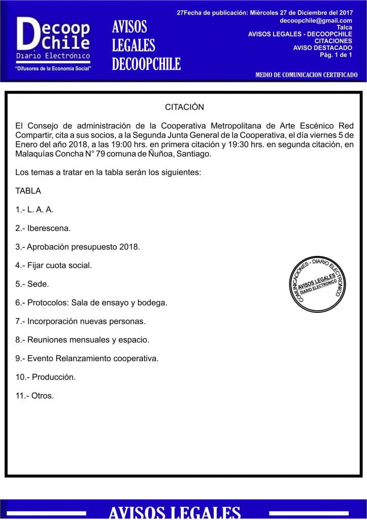 La Cooperativa Metropolitana de Arte Escénico Red Compartir, cita a una junta general de socios para el día 05 de Enero de 2018.