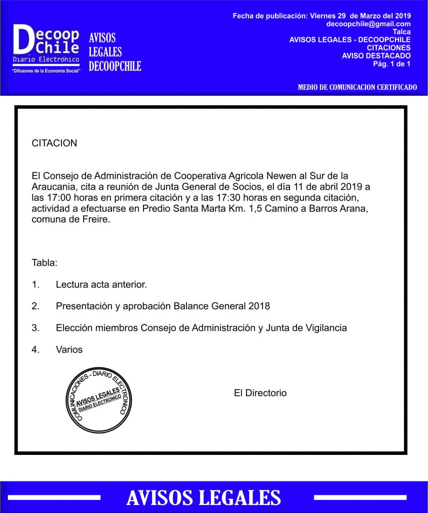 Se cita a Junta de Socios de la Cooperativa Newen al Sur, que se llevará a cabo el próximo 11 de Abril.