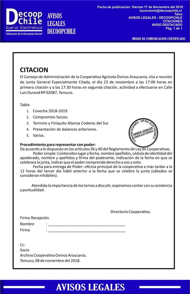 Se cita a Junta de Socios de la Cooperativa Ovinos Araucania, que se llevará a cabo el próximo 23 de Noviembre .