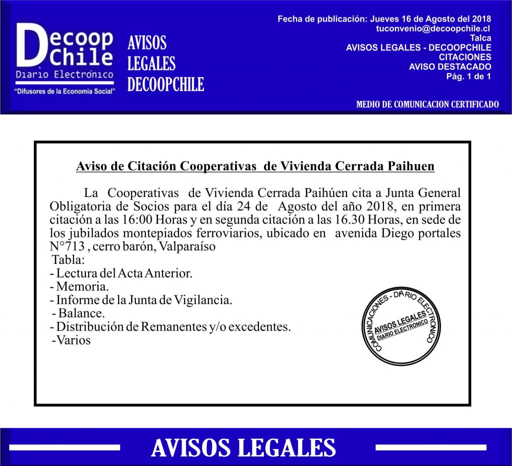 Se cita a Junta de Socios de la Cooperativa Paihuen, que se llevará a cabo el próximo 24 de Agosto