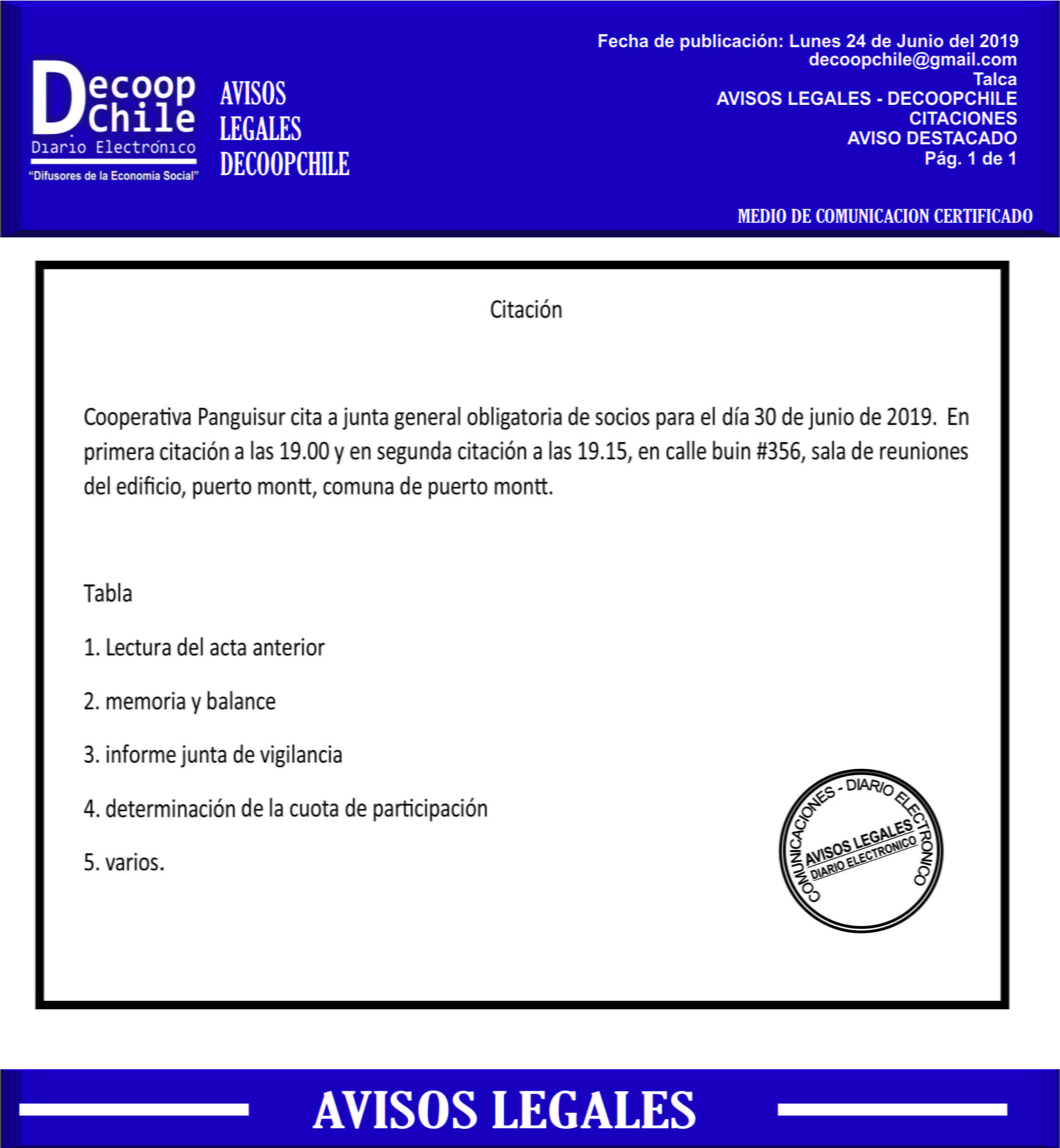 Se cita a Junta de Socios de la Cooperativa Panguisur, que se llevará a cabo el próximo 30 de Junio