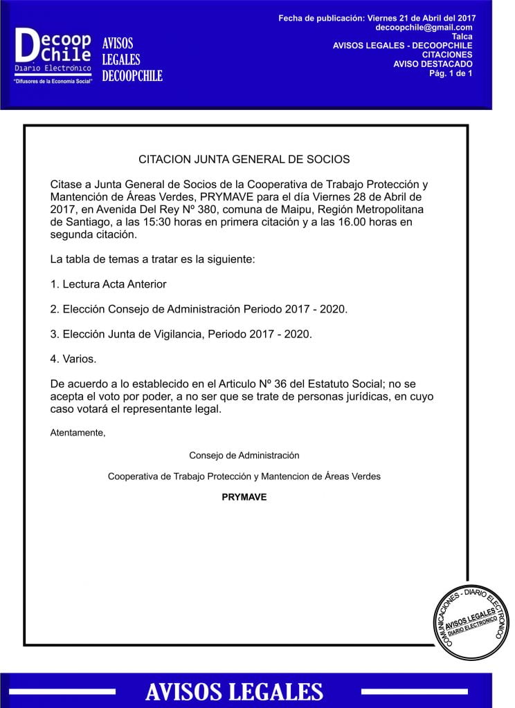 Se cita a Junta general a los socios de la Cooperativa PRYMAVE, que se llevará a cabo el próximo 28 de abril.