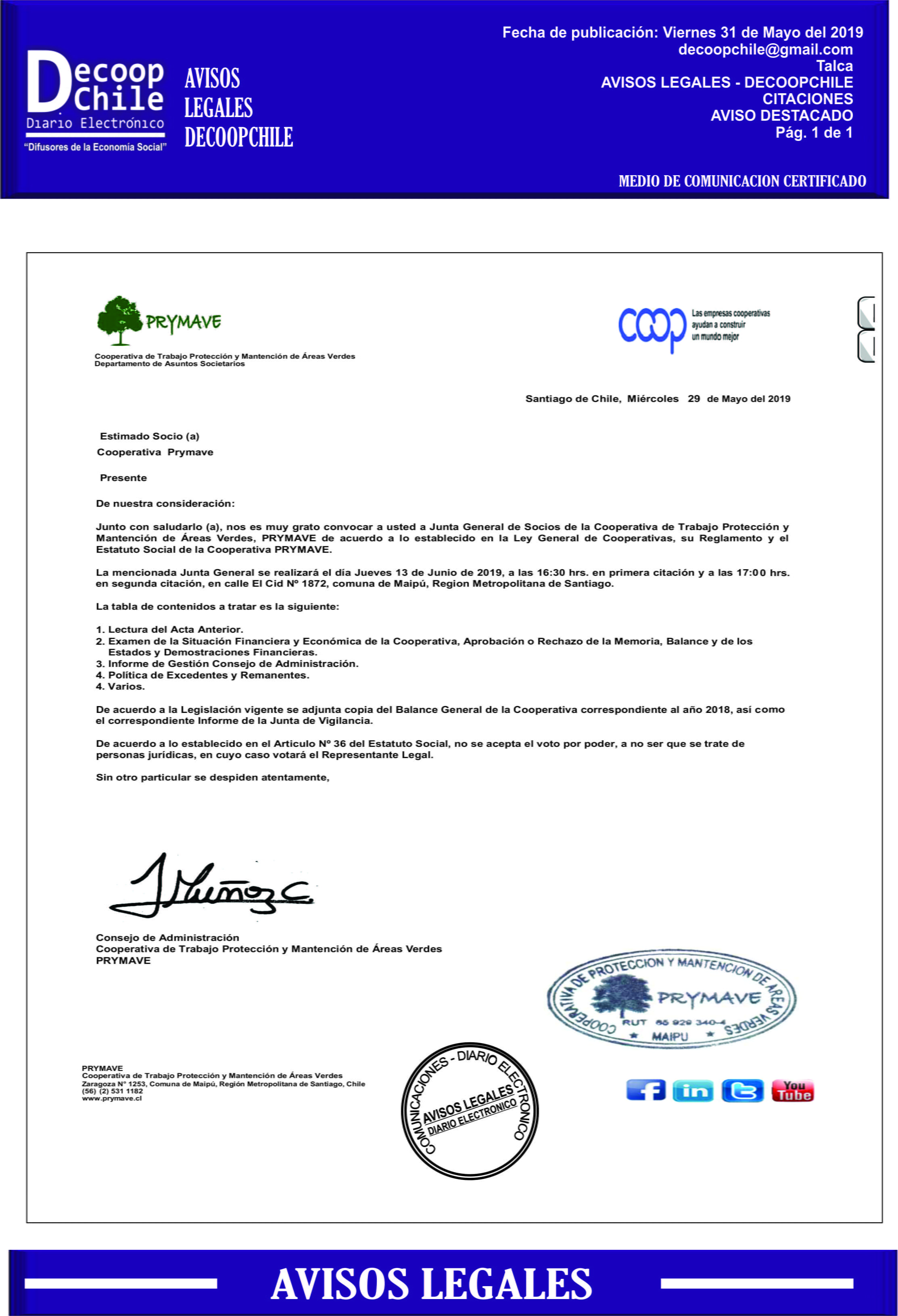 Se cita a Junta de Socios de la Cooperativa Prymave que se llevará a cabo el próximo 13 de Junio