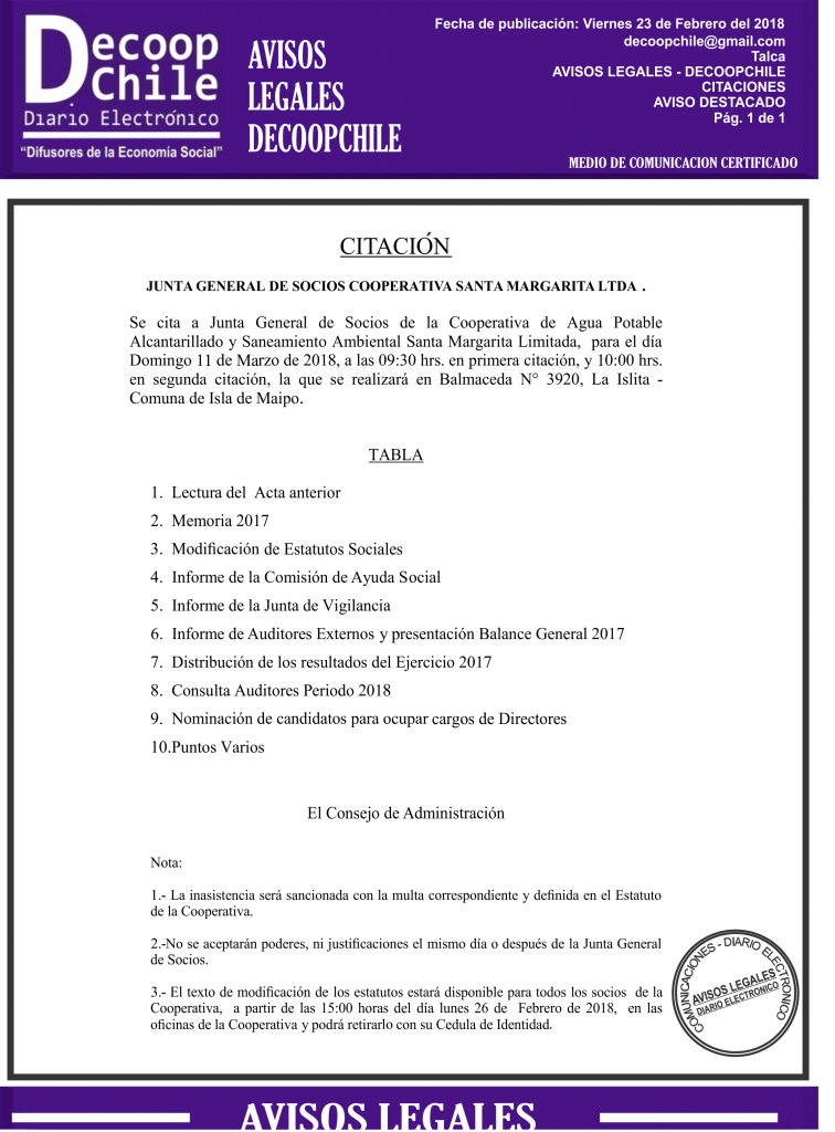 La Cooperativa Santa Margarita Ltda. cita a una junta general de socios para el día 11 de marzo de 2018.