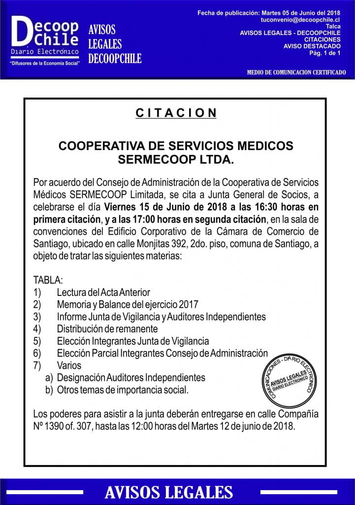 Se cita en Primera y Segunda Citación de  Junta general a los socios de la Cooperativa Sermecoop que se llevará a cabo el próximo 15 de Junio.
