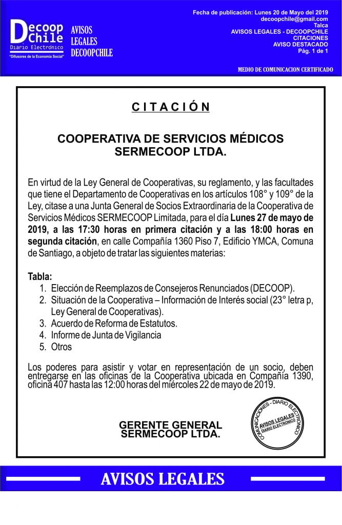 Se cita a Junta de Socios de la Cooperativa Sermecoop. que se llevará a cabo el próximo 27 de Mayo.