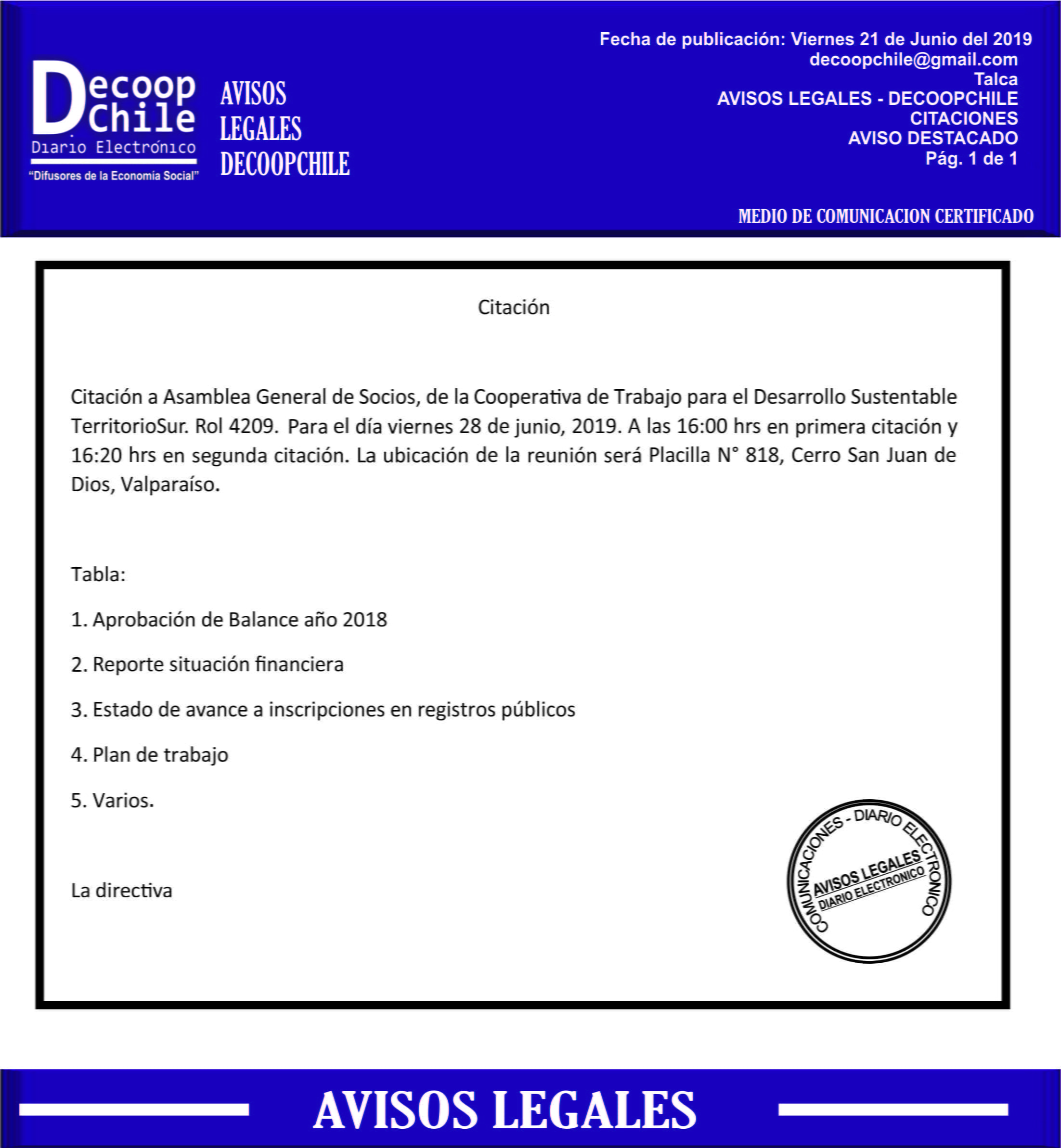 Se cita a Junta de Socios de la Cooperativa Territorio Sur que se llevará a cabo el próximo 28 de Junio