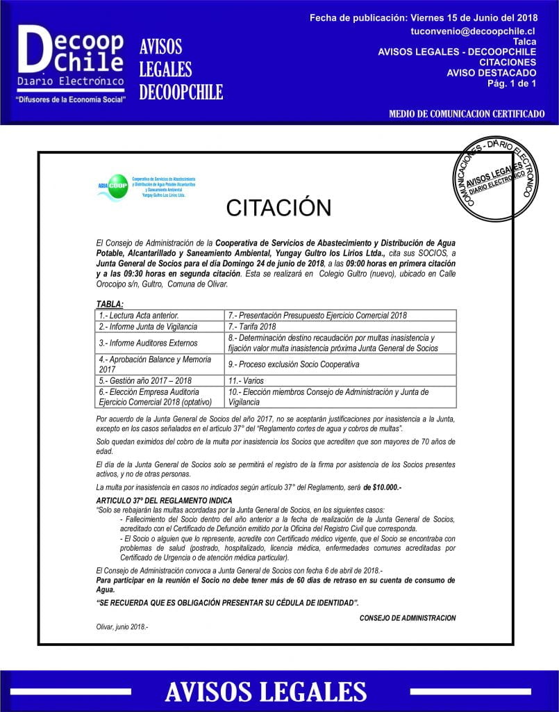 Se cita a Junta general a los socios de la Cooperativa Yungay Gultros Los Lirios Ltda.. que se llevará a cabo el próximo 24 de Junio.