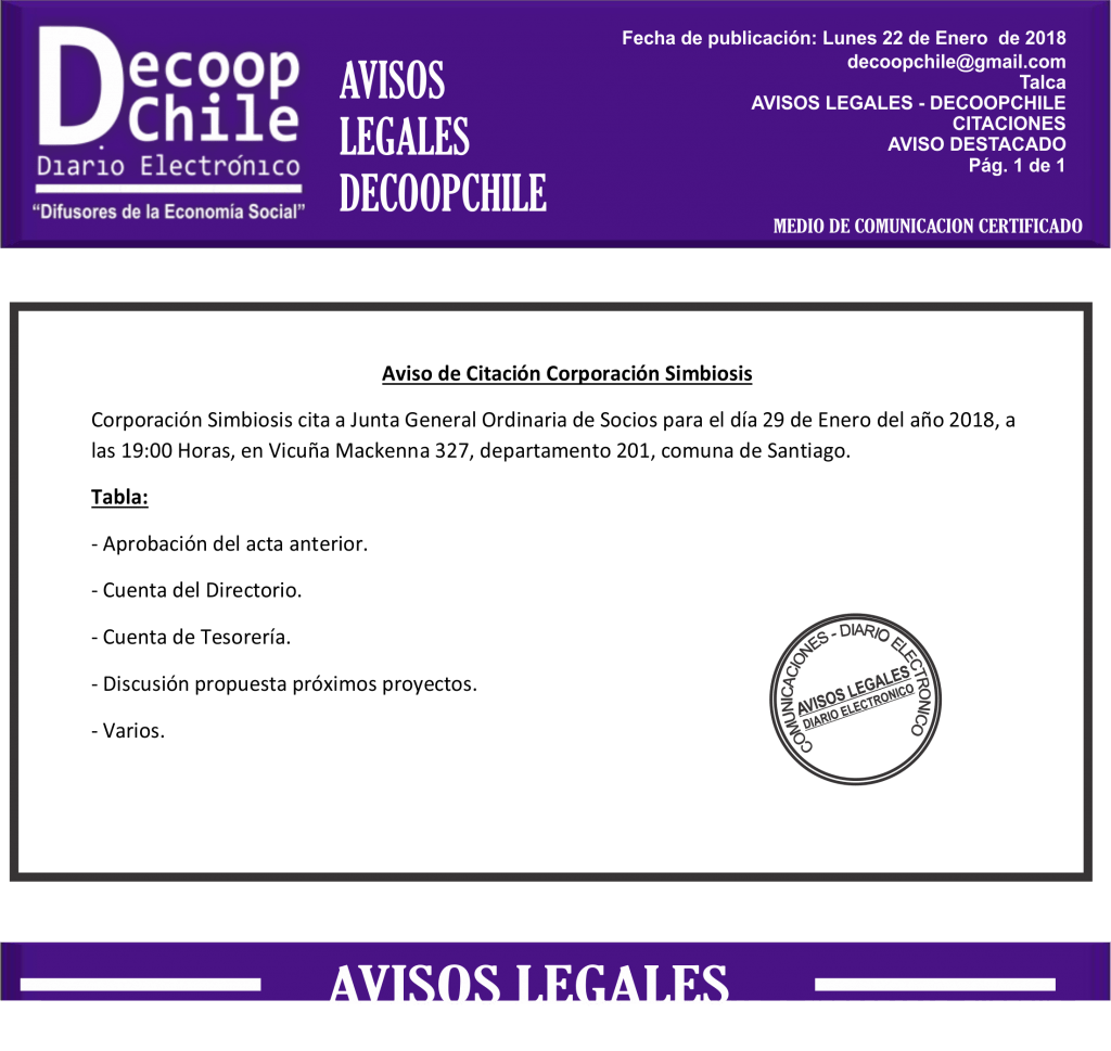 La Corporación Simbiosis, cita a una junta general de socios para el día 29 de Enero de 2018.