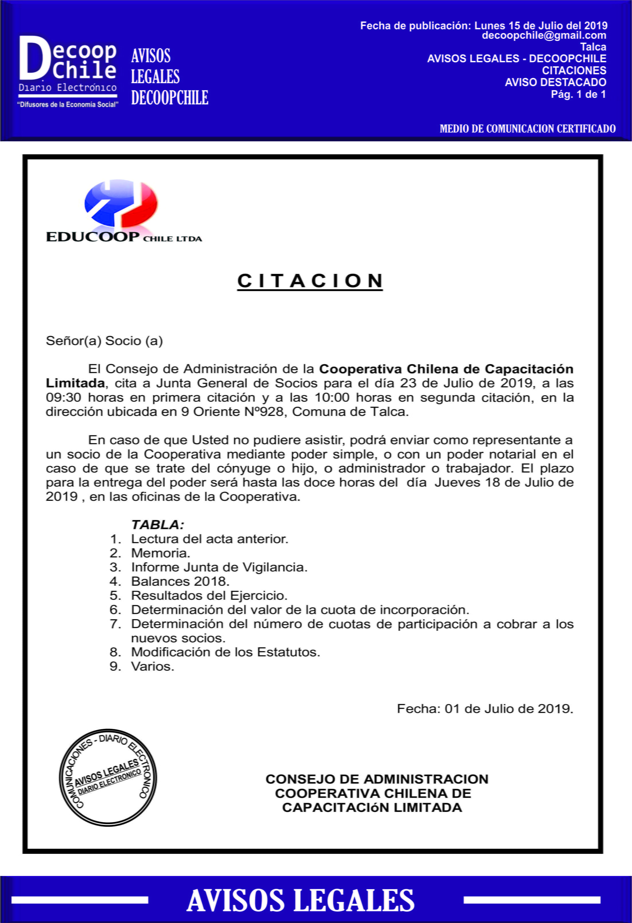 Se cita a Junta de Socios de la Cooperativa Chilena de Capacitación Educoop, que se llevará a cabo el próximo 23 de Julio