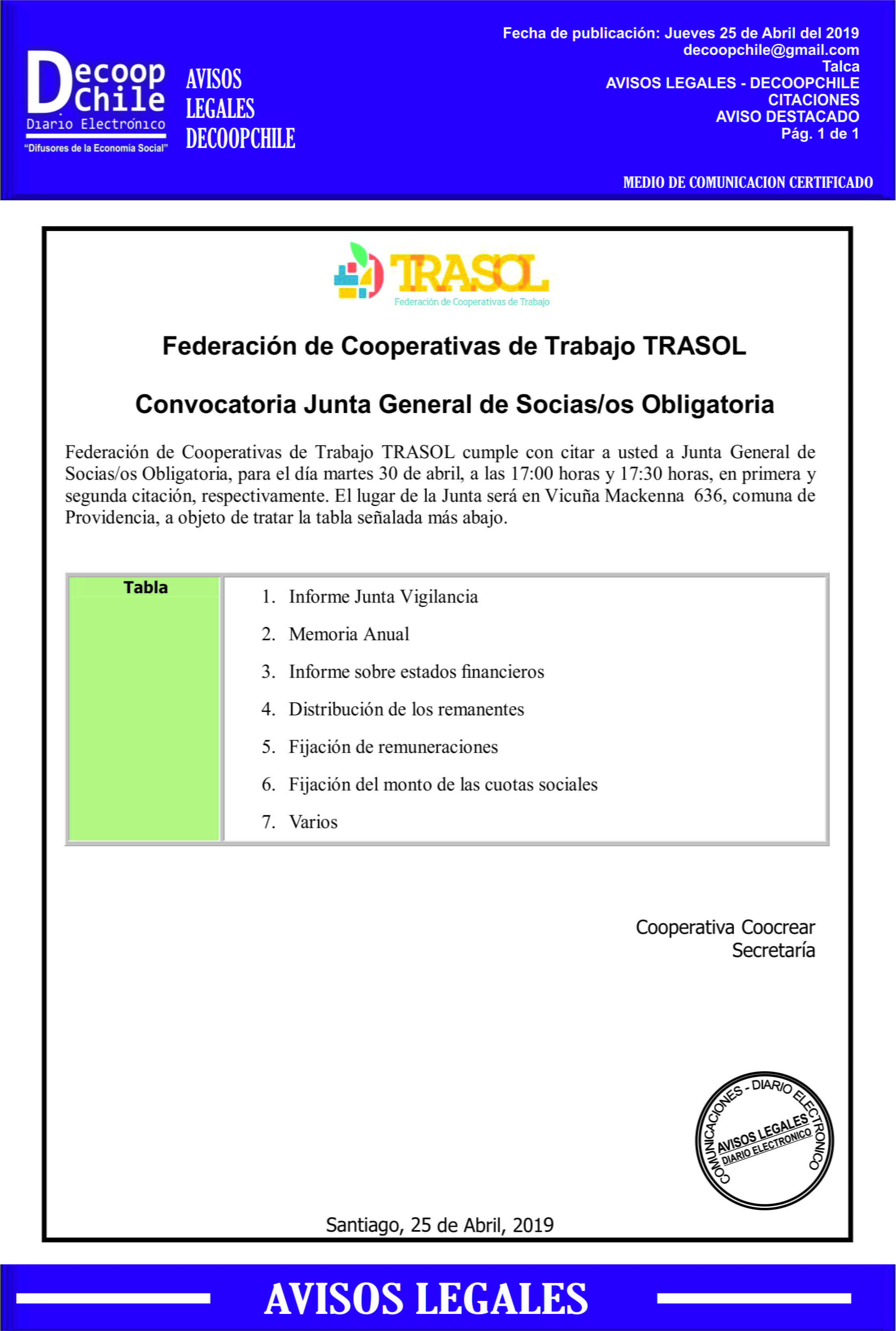 Se cita a Junta de Socios de la Federación de Cooperativas de Trabajo TRASOL, que se llevará a cabo el próximo 30 de Abril.