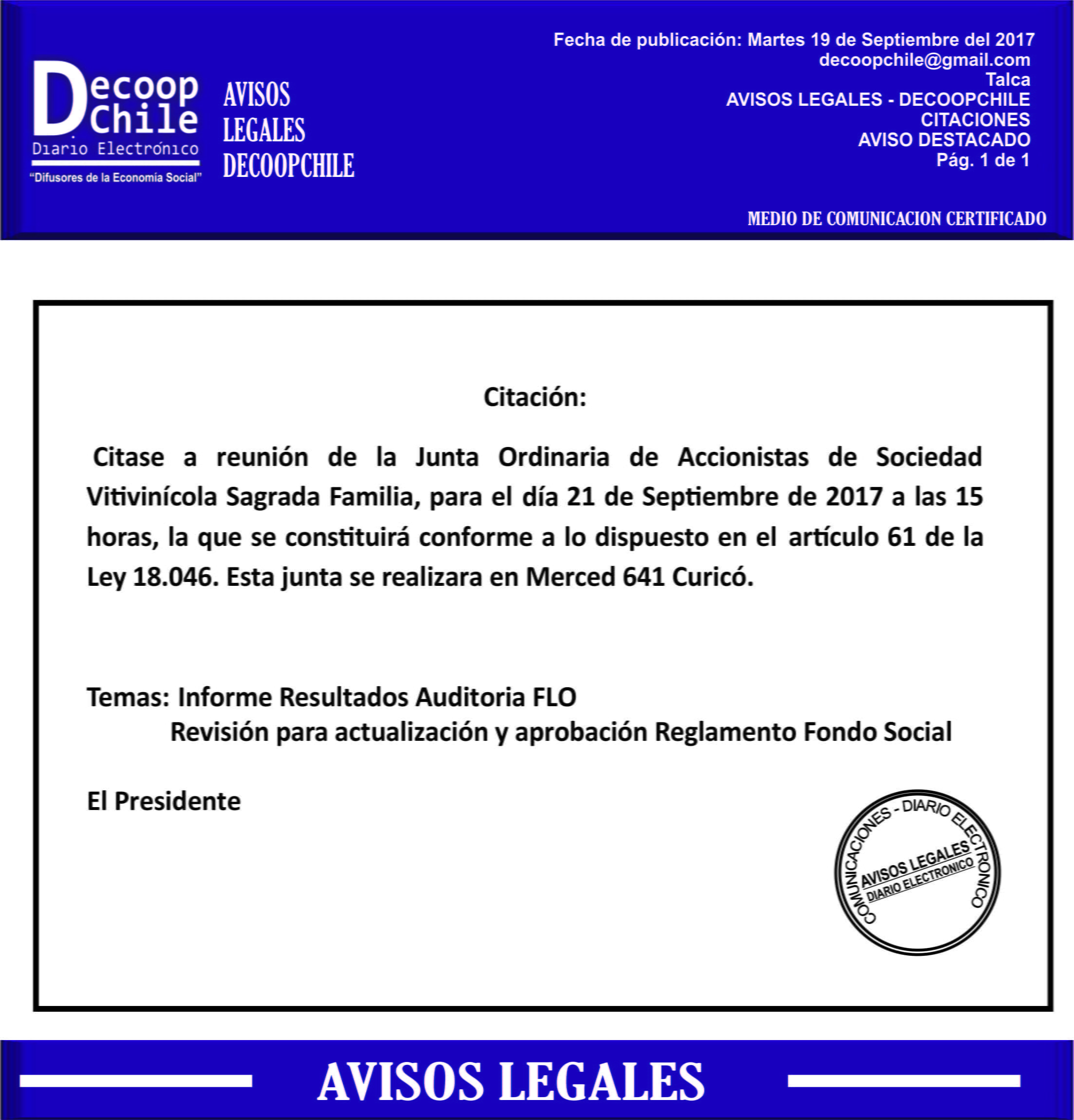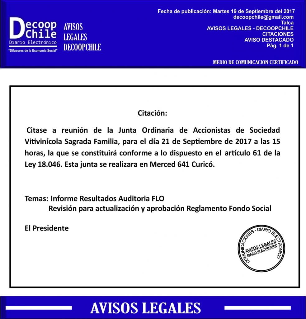 Citase a reunión de la Junta Ordinaria de Accionistas de Sociedad Vitivinícola Sagrada Familia, para el día 21 de Septiembre de 2017