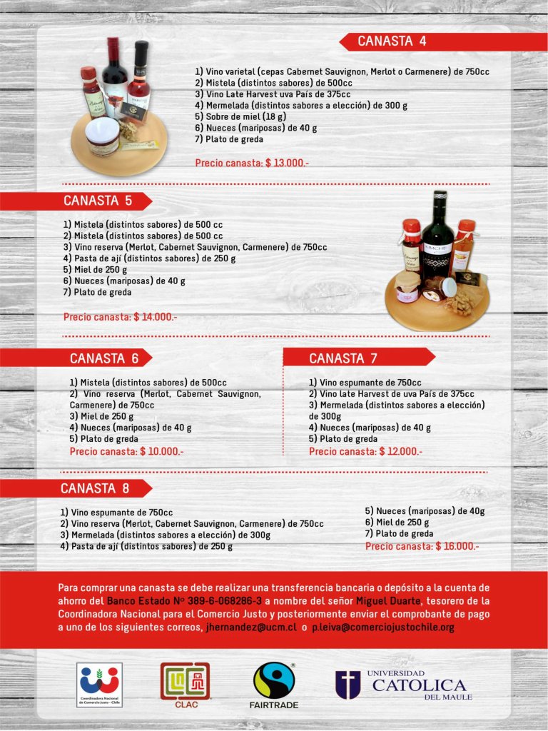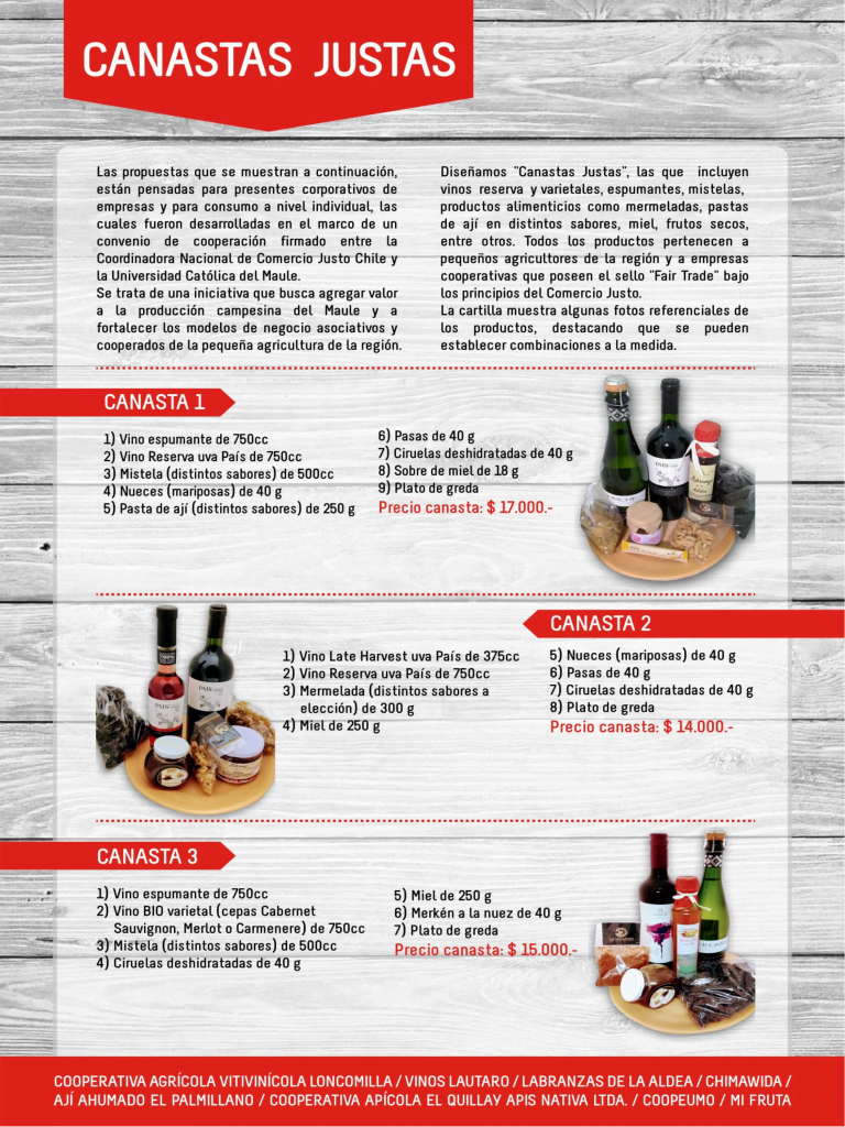 Dicha Canasta Justa, se ha desarrollado bajo el Convenio de Colaboración firmado entre la Coordinadora Nacional de Comercio Justo Chile y la Universidad Católica del Maule, avanzando en la Campaña de Universidades Latinoamericanas por un  Comercio Justo.