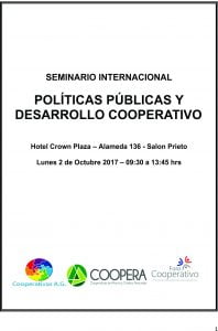 Este lunes, la Asociación de Cooperativas de Ahorro y Crédito –COOPERA- junto a la Asociación Gremial de Cooperativas del Sur y el Foro Cooperativo, realizaran un Seminario Internacional, que incluirá la participación de los representantes de los principales candidatos presidenciales del país (economista Tomás Flores por Sebastián Piñera, diputado Rodrigo González por Alejandro Guillier, Nicolás Grau por Beatriz Sánchez y economista Guillermo Larraín por Carolina Goic).