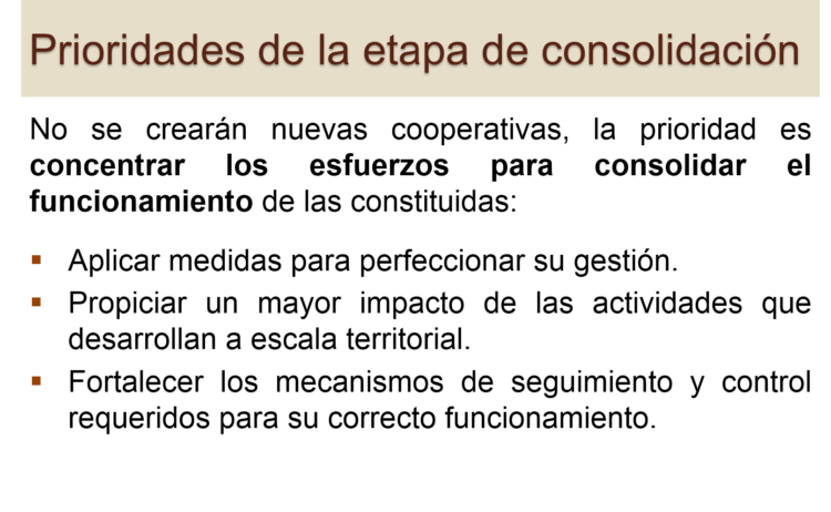 Seminario nacional, en septiembre próximo; los regionales para la preparación de los replicadores en el propio mes; y los de provincias y municipios, para la preparación de los cooperativistas, en octubre.